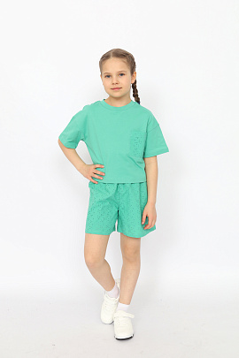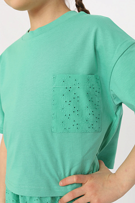 Футболка со спущенным плечом и короткими рукавами. Спереди карман из ришелье. Горловина круглая, обработана притачной бейкой. По ростку горловины шов притачивания закрыт долевиком.