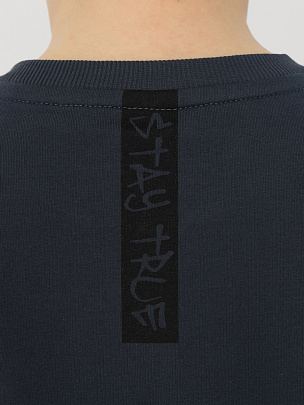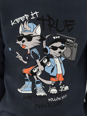 Джемпер с длинными рукавами и притачным поясом. Рукава втачные с манжетами по низу. Воротник, манжеты и пояс выполнены из полотна с эластаном. Перед и спинка декорированы принтом "Оставайся хладнокровным, следуй своим собственным правилам".