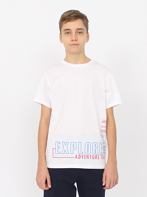 Футболка для мальчика с коротким рукавом из набивного полотна. Горловина обработана притачной бейкой из рибаны с лайкрой. Перед декорирован принтом.