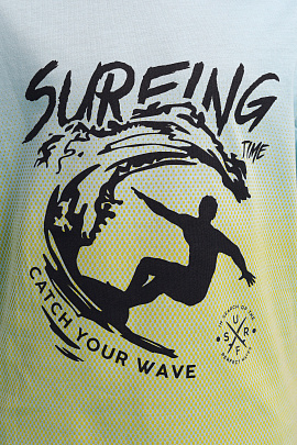 Футболка для мальчика свободного покроя. Рукав втачной, горловина обработана притачной бейкой из рибаны с лайкрой. Перед декорирован принтом "Панно".