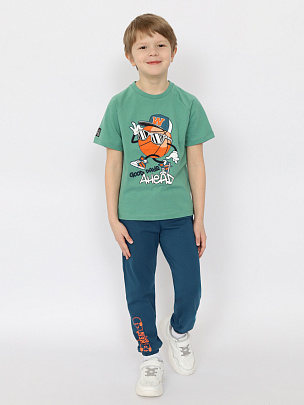 Брюки с притачным поясом и манжетами. Пояс из полотна с добавлением лайкры и эластичной резинкой внутри. Низ брюк с эластичной резинкой внутри. Передняя половинка брюк декорирована принтом "Продолжай катиться".