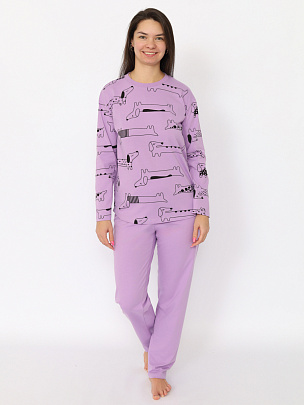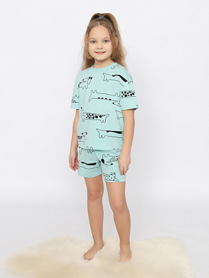Пижама набивная из футболки и шорт. Футболка оверсайз с коротким рукавом. Горловина обработана притачной бейкой из рибаны с лайкрой. Шорты свободного покроя длиной до середины бедра. Цельнокроеный пояс обработан плоским швом вподгибку с одновременным прокладыванием резинки.