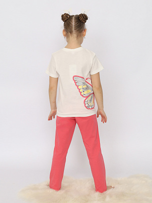Пижама гладкокрашенная из футболки и брюк. Футболка свободного покроя с коротким рукавом. Горловина обработана притачной бейкой из рибаны с лайкрой. На правом боку принт в виде бабочки. Прямые брюки умеренного объёма выполнены из полотна дополнительного цвета. Цельнокроенный пояс обработан плоским швом вподгибку с одновременным прокладыванием резинки.