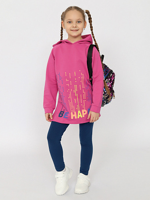 Костюм из худи и легинсов для девочки. Худи с капюшоном свободного силуэта, манжеты из основного полотна, которые надежно облегают запястье ребенка. Спереди декорировано принтом с надписью - "Будь счастлив". Мягкие и комфортные легинсы для девочки на каждый день. Отличный вариант для прогулок и активного отдыха, в поездках незаменим.