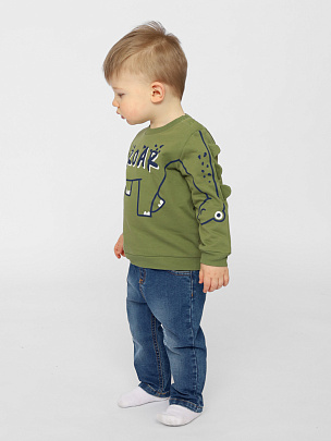 Свитшот с декоративной отделкой по рукаву.Воротник,манжет и пояс выполнены из материала с эластаном.Принт по переду.