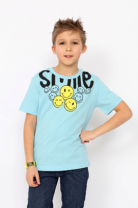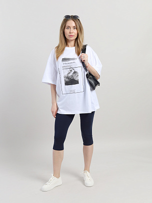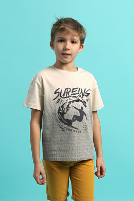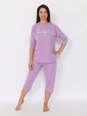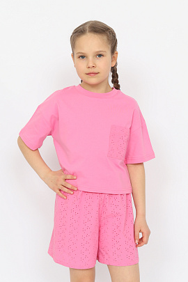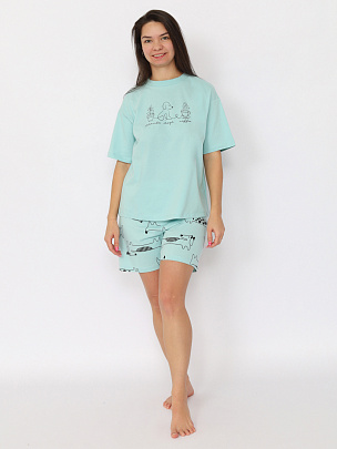Гладкокрашенная пижама из футболки и шорт. Футболка свободного покроя с коротким рукавом. Горловина обработана притачной бейкой из рибаны с лайкрой. Перед оформлен небольшим принтом. Шорты свободного покроя длиной ниже колена выполнены из полотна дополнительного цвета. Цельнокроенный пояс обработан плоским швом вподгибку с одновременным прокладыванием резинки. На левой половинке внизу небольшой принт.