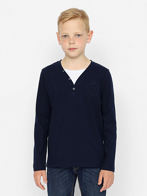 Джемпер с длинным втачным рукавом. Воротник с вырезом и имитацией футболки, по краю ланки воротника расположены декоративные пуговицы.