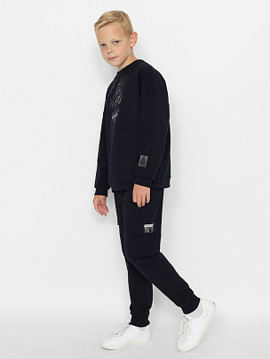 Джемпер для мальчика свободного силуэта с карманом спереди и притачным эластичным поясом по низу. Горловина круглая, обработана притачным воротником из полотна с эластаном. Рукава длинные с эластичными манжетами по низу. Перед джемпера декорирован принтом "Маленькие шаги приводят к большим переменам".