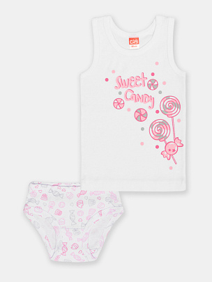 Гладкокрашенный комплект, выполненный полностью в одном цвете. Майка на бретелях из основного полотна. Срезы пройм и горловины окантованы бейкой из основного плотна. Перед оформлен шелкографией. Верх трусов обработан плоским швом вподгибку с одновременным прокладыванием резинки. Проймы ножек обработаны окантовкой из основного полотна.