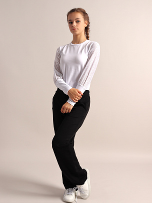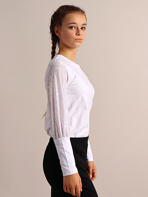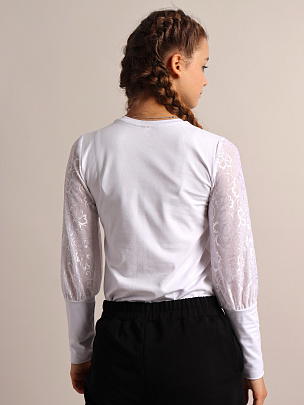 Джемпер для девочки с длинными втачными рукавами. Рукава из сетки с рисунком и высокими манжетами из основного полотна. Горловина круглая, обработана притачной бейкой из основного полотна.