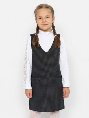 Сарафан для девочки выполнен из набивного футера - имитирует костюмную ткань. Школьный сарафан на широких бретелях без лишних застежек и замков имеет удобный А-силуэт. Добавление в состав эластана обеспечивает идеальную посадку и полную свободу движений. Спереди сарафана расположены прорезные карманы в шве. Сарафан удобно надевать поверх блузки, водолазки, джемпера или футболки, он будет актуален на протяжении всего учебного года.