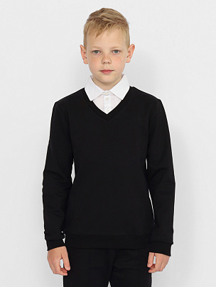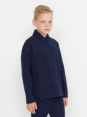 Джемпер для мальчика с длинными рукавами и притачным поясом из полотна с эластаном. Нижние срезы рукавов обработаны притачными манжетами из полотна с эластаном. Горловина круглая, обработана эластичным воротником.