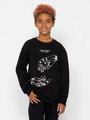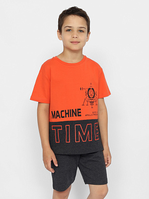 Толстовка с длинными втачными рукавами и манжетами из полотна с добавлением эластана. В нижней части толстовки расположена декоративная планка контрастного цвета. Капюшон с лицевой частью и декоративным принтом, шнурок декорирован вязаной нашивкой. Перед декорирован принтом "Панно" мир динозавров. Брюки с притачным поясом, манжетами и функциональными карманами. Пояс и манжеты выполнены из полотна с эластаном.