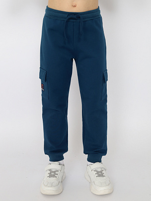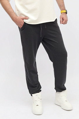 Брюки на широкой резинке по низу, слегка зауженные к низу. Пояс отрезной из кашкорсе с эластаном, по поясу выполнена кулиска, кругловязанный шнур, с застроченными концами, вставлен в петли. Карманы наклонные, с отстрочкой по входу в карман.
