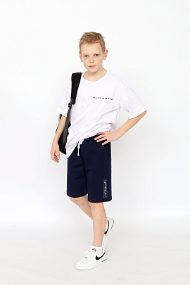 Шорты для мальчика с боковыми карманами и притачным поясом из основного полотна. В пояс вставлена резинка и функциональный шнур.